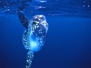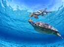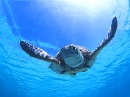 撮影では、ウミガメにストレスを与えたり、自然の営みを邪魔しないよう、ストロボやライトは一切使用しないで自然のままで撮影し、水中でも、おどかさないようにそっとアプローチして、その生活環境を守るため、どこにも手も足もつかずに、浮きも沈みもしない状態(中性浮力)を保ったままで撮影しています。