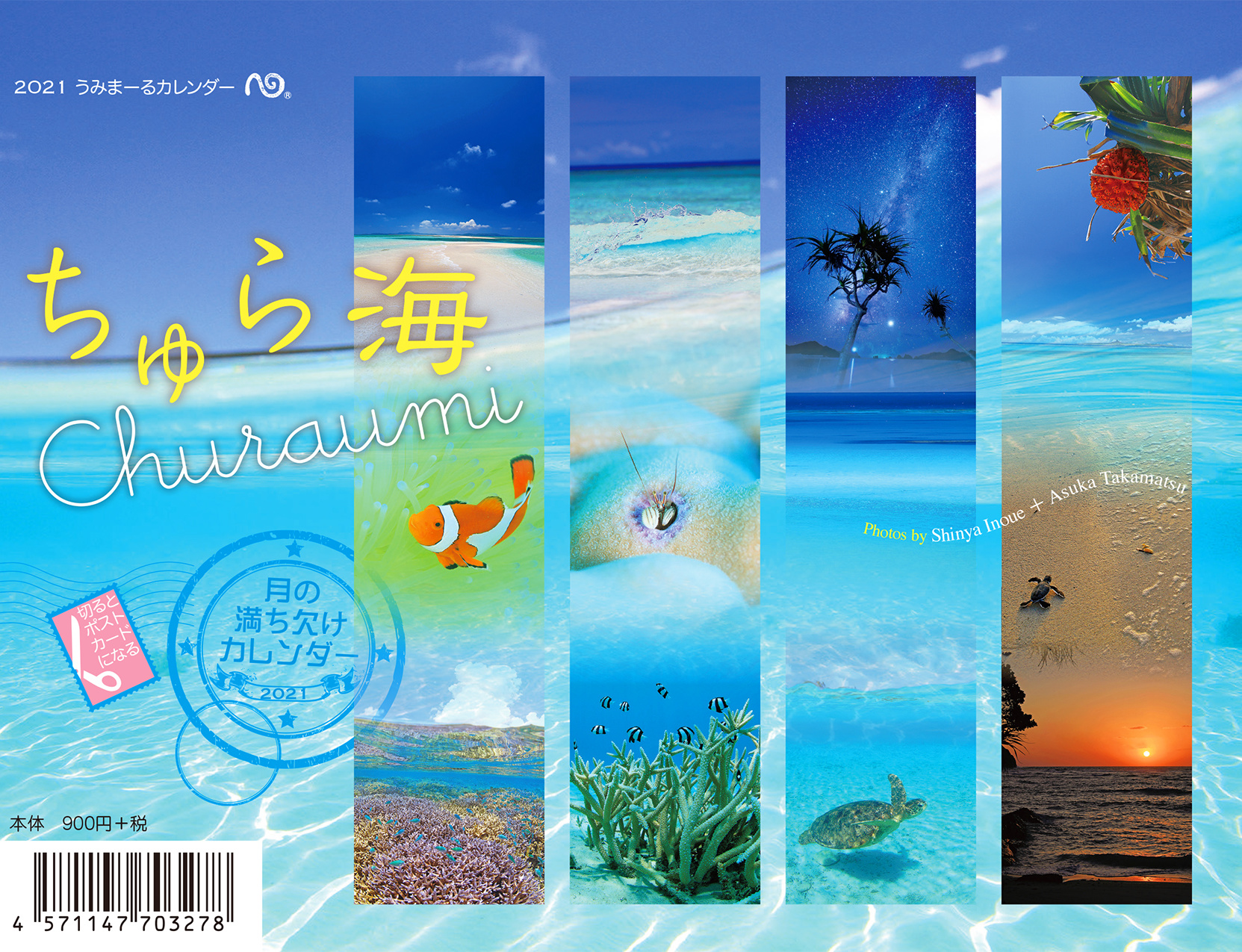 カレンダー部分には、毎日の月の満ち欠けのデザインが入り、月と海のリズムをいつも感じられる12ヶ月です。また、自然の色の美しさや輝きがより再現できるよう、高品質アート紙使用プレス加工(書き込みは油性ペンが最適)。切り離せば、写真部分はポストカードに、カレンダー裏はメモになる楽しみ3倍のカレンダーです。キャプションには、心和む沖縄の言葉もあり。
