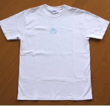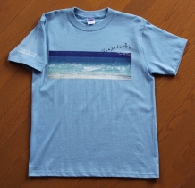 胸に小さな波の写真デザイン、右袖にうみまーるの雫ロゴ