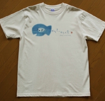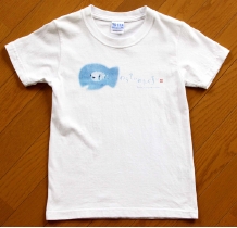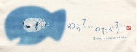 胸にハリセンボンの正面顔の写真と、沖縄の言葉で「わらてぃ わたぐすい」=「笑顔は元気の源!」。