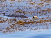 初めは前後の脚をダラリと伸ばし、頭を藻につっこんでいたので、死んでいるようにも見えましたが、しばらくすると、おもむろに頭を上げて、プハッと息継ぎをしたので、生きていることを確認。ひなたぼっこをしながらプカプカと昼寝をしていた様子で、背中には小さなコバンザメも一緒です。